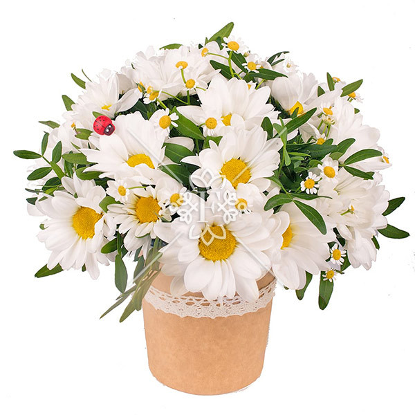 Выбирая  подарок, обратите свое внимание на чудесную композицию «Первое признание». Нежность и воздушность в каждом лепестке белоснежных кустовых хризантем, похожих на милые ромашки, покоряет  с одного взгляда!